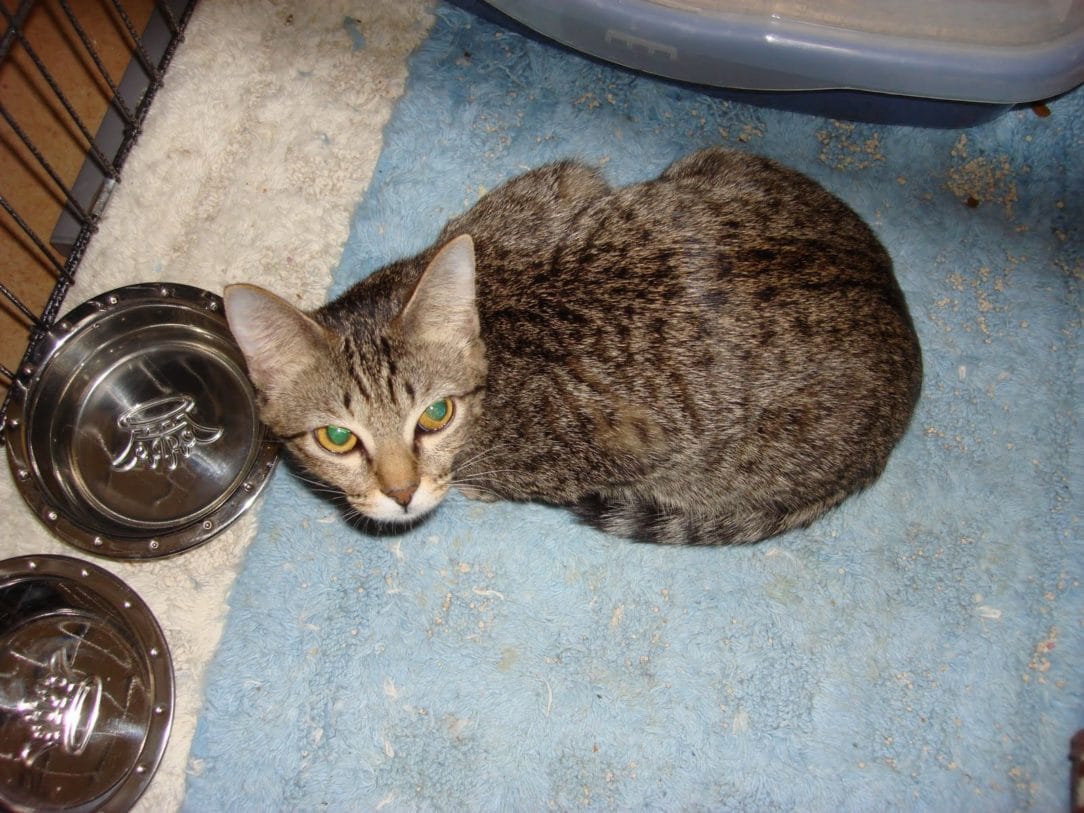 Now she and I have to play a game every night. Before I put her in the cage I put her in the main litter box. She hangs out there for a few moments without doing anything and then tries to come out and run under the bed. So, I grab her and put her in the cage. As soon as I turn my back she makes a dash for the second box. I then have to grab her before she manages to squat and stuff her back into the main litter box. I then block the door so she can’t come back out. She seems to wait a while to see if I’m serious, and when she realizes she can’t get out, she does her business. It’s as though she had been waiting all day and after almost reaching satisfaction she just can’t wait to try to go in the emergency box again. She gives in and uses the main box. It’s amusing too, because her scratches at the litter sound indignant, as though I’ve offended her in some way. When she’s done, and I unblock the door, she won’t come out. I have to stick my hand in there under her belly and haul her out. I put her back in the cage and she looks at me as though I’m crazy. She eyes the second litter box longingly, but having nothing to offer it, she lays down and rests. I wonder how many nights it will be before she gets the point? If she ever does? Look at that picture of her, huddling, as though she really has to crap and is dying for me to leave her alone so she can do it without being put in the other box. Weird cat…