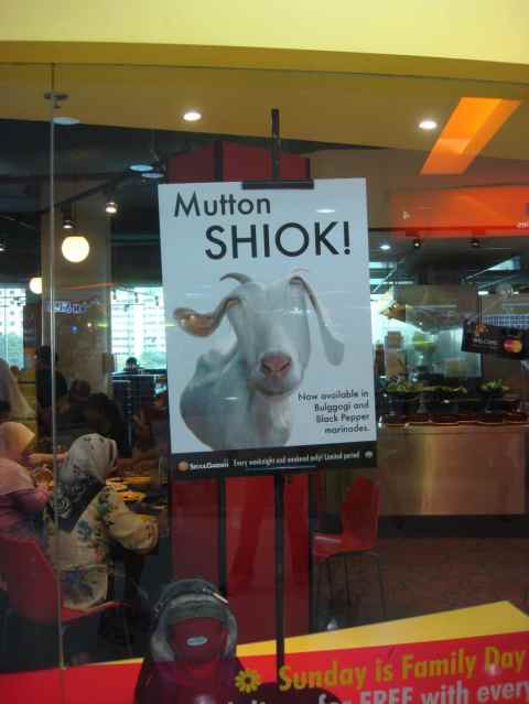 On Sunday afternoon we went out for a movie, and then afterwards we decided to have dinner at Seoul Food.  It was a group decision.  My wife and I had often seen the place but had decided not to eat there.  We just didn’t care much for the way it looked, and this picture of the goat in the window deterred me: