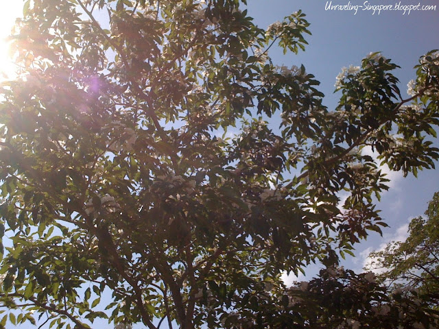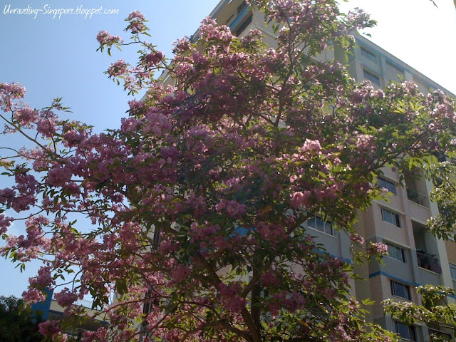 These trees are planted down the middle of some of the roadways here in Pasir Ris. It’s really nice to look at. I’m going to take a walk down to Pasir Ris Park sometime this week, if I have time, to see if the trees there are blooming and to try to get some better photos.