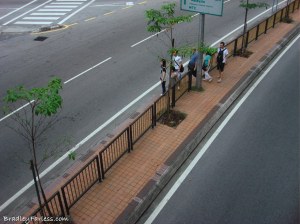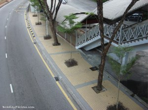 Anyhow, part of the trip to between the lines includes going over a major road. There’s a pedestrian bridge. Unfortunately, the escalator on that bridge is broken and it appears to have been that way for a long time. None of the pedestrian bridges I’ve seen in Singapore, except maybe one on Orchard Road, have escalators so we just used the stairs. Apparently, the average Malaysian doesn’t want to deal with that though because everyone else walked out into the road and then used a spot where the center barrier had been broken down to get through.