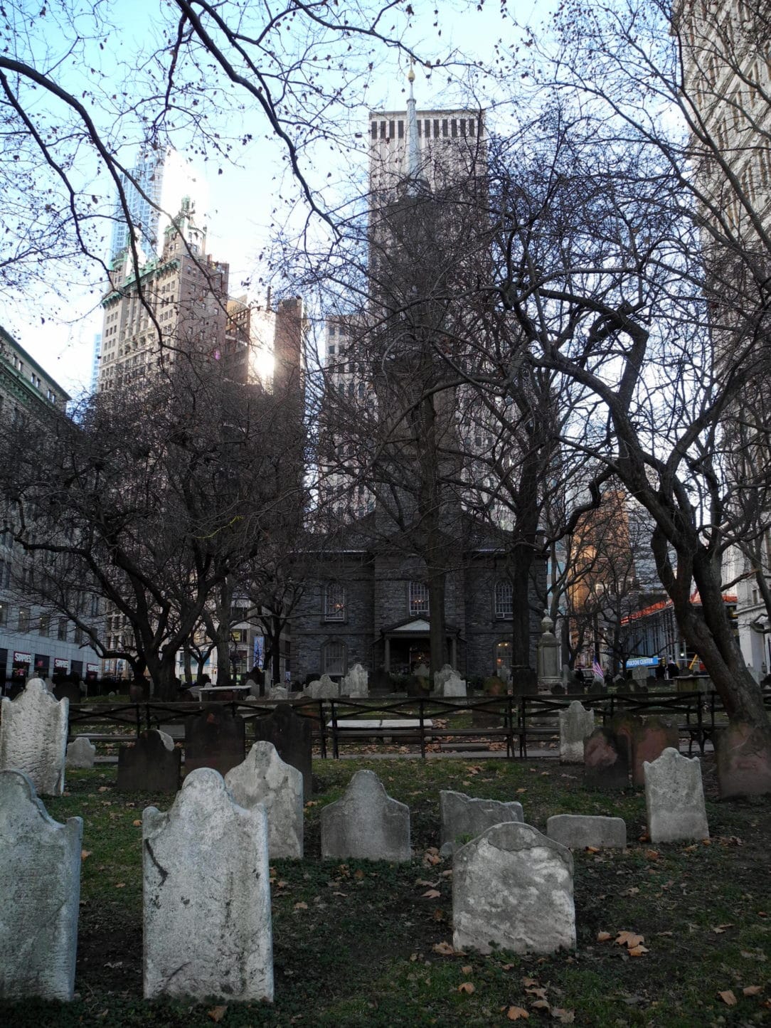 We walked through the cemetery first. She was impressed by how old the headstones are. I am too. It’s weird to see gravestones still erect for people that died in the 1760s next to so many buildings of modern construction. It’s so out of place. It’s nice to see that the chapel and the cemetery survived and weren’t torn down to build something new, especially in considering the important role the chapel played during the September 11th tragedy, when rescue and aid workers used the sanctuary as a place to rest and recover for a few hours before going back out to look for survivors again.