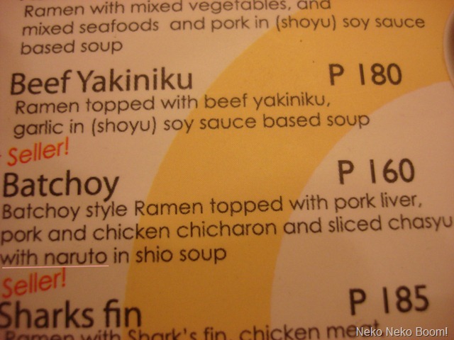 If you look at the red underlined portion under the menu item ‘Batchoy’ you’ll see that the ramen includes ‘naruto’. I don’t watch Naruto but I was really amused when I saw this. I was wondering if it was a typo or if there actually is something called ‘naruto’. Well, turns out that naruto is a type of kamaboko, which has the following definition on Wikipedia: