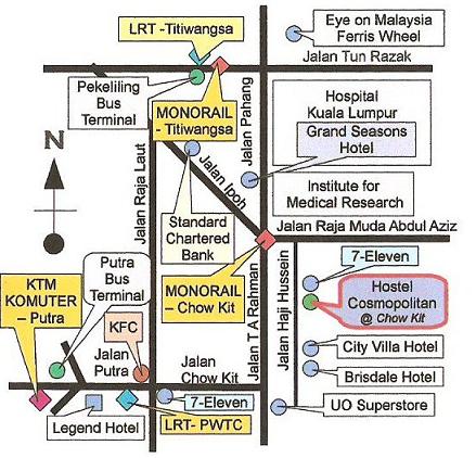 Hostel Cosmopolitan is located near the Chow Kit monorail station.  It’s a bit hard to find when you first get to Chow Kit, so make sure you take a map with you!  Also, don’t be put off by the outside of the building.  It’s a bit rough looking, but the interior is very clean and comfortable.  Hostel Cosmopolitan is one of the best places I’ve stayed, guest house or not.