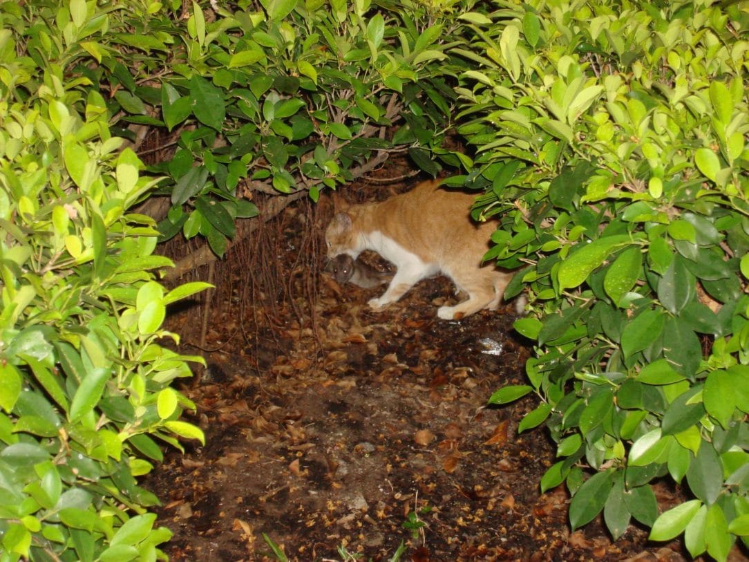 To illustrate I have some photos of a cat doing his work. I was lucky enough to see this guy cleaning up the 24 hour hawker in Pasir Ris the other night. This is in the bushes just in front of the air conditioned area of the hawker center, near where people typically park motorbikes and bicycles at night.