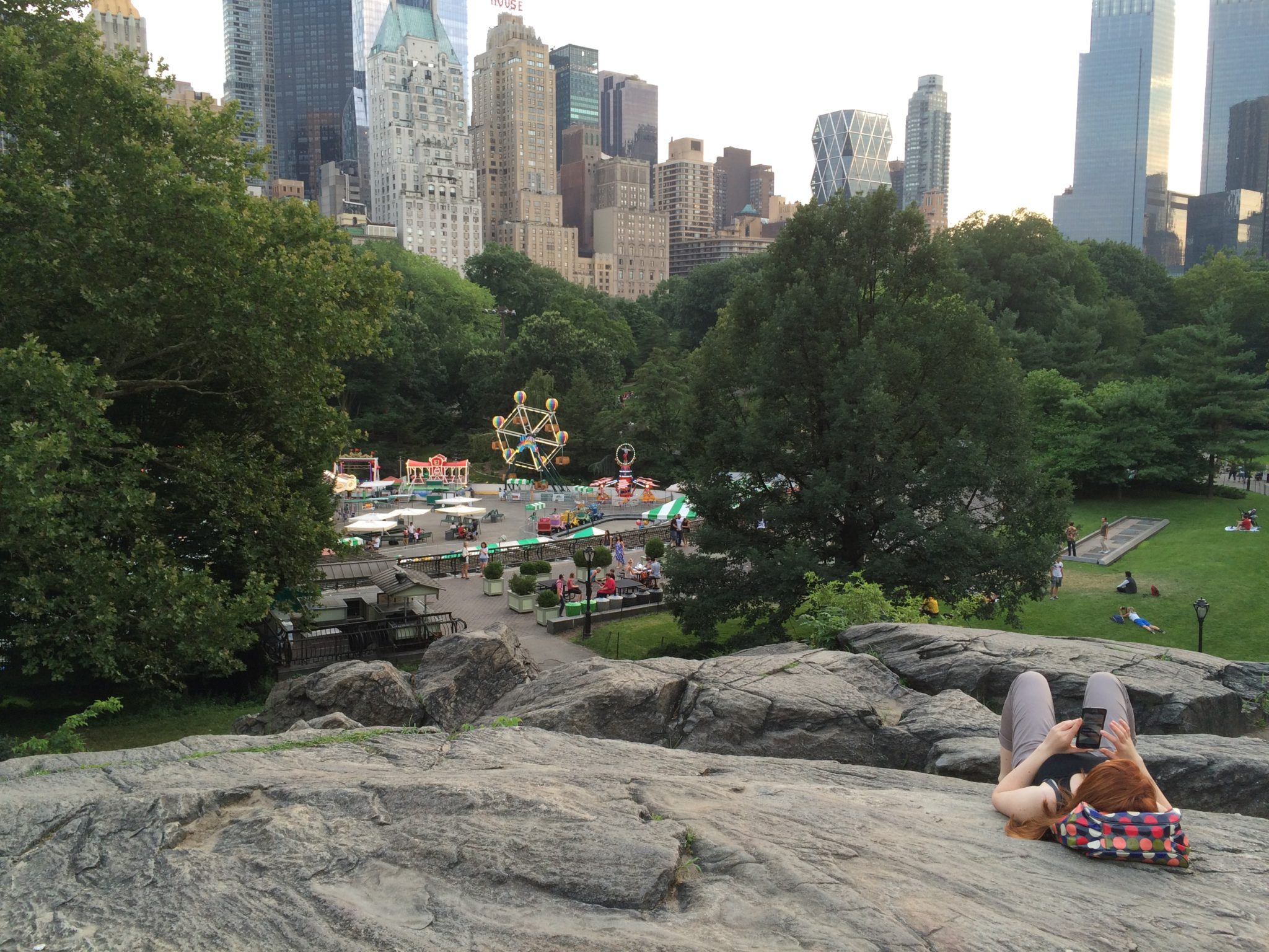 A girl laying on the huge rock overlooking the Victoria Gardens Amusement Park.