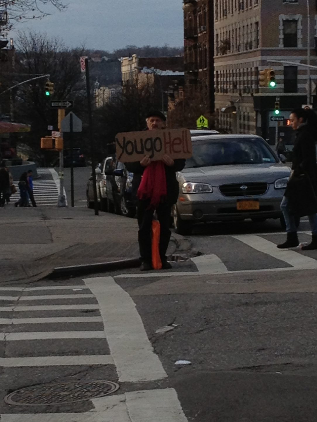 When I walked up to the corner, a man standing by the vendor cart that’s usually there at the base of the hill selling drinks and snacks was screaming at this old guy, “No! You go to Hell!” I couldn’t hear what the old man was saying clearly because I had headphones on, but I imagine he was saying, “No, you!” or something like that. I don’t know if the guy was seriously offended by the old man’s sign, or if he was just doing it to agitate the old guy.