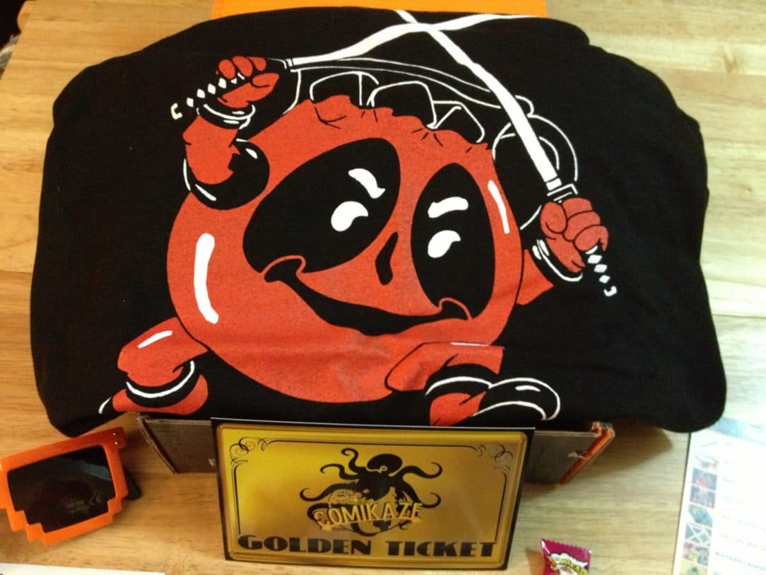 8-Bit Glasses, Robot Sticker and Loot Crate Wall TangramsMario/TMNT Mashup Sticker, Warheads and BIC 2-in-1 StylusStan Lee’s Comikaze Golden Ticket