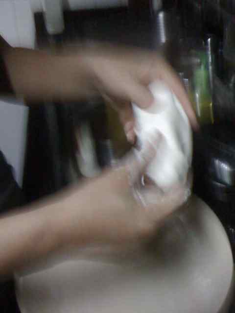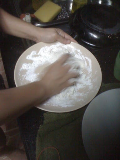 This is where she cracked the top off the egg and started pouring it onto the flour she had put on the plate.