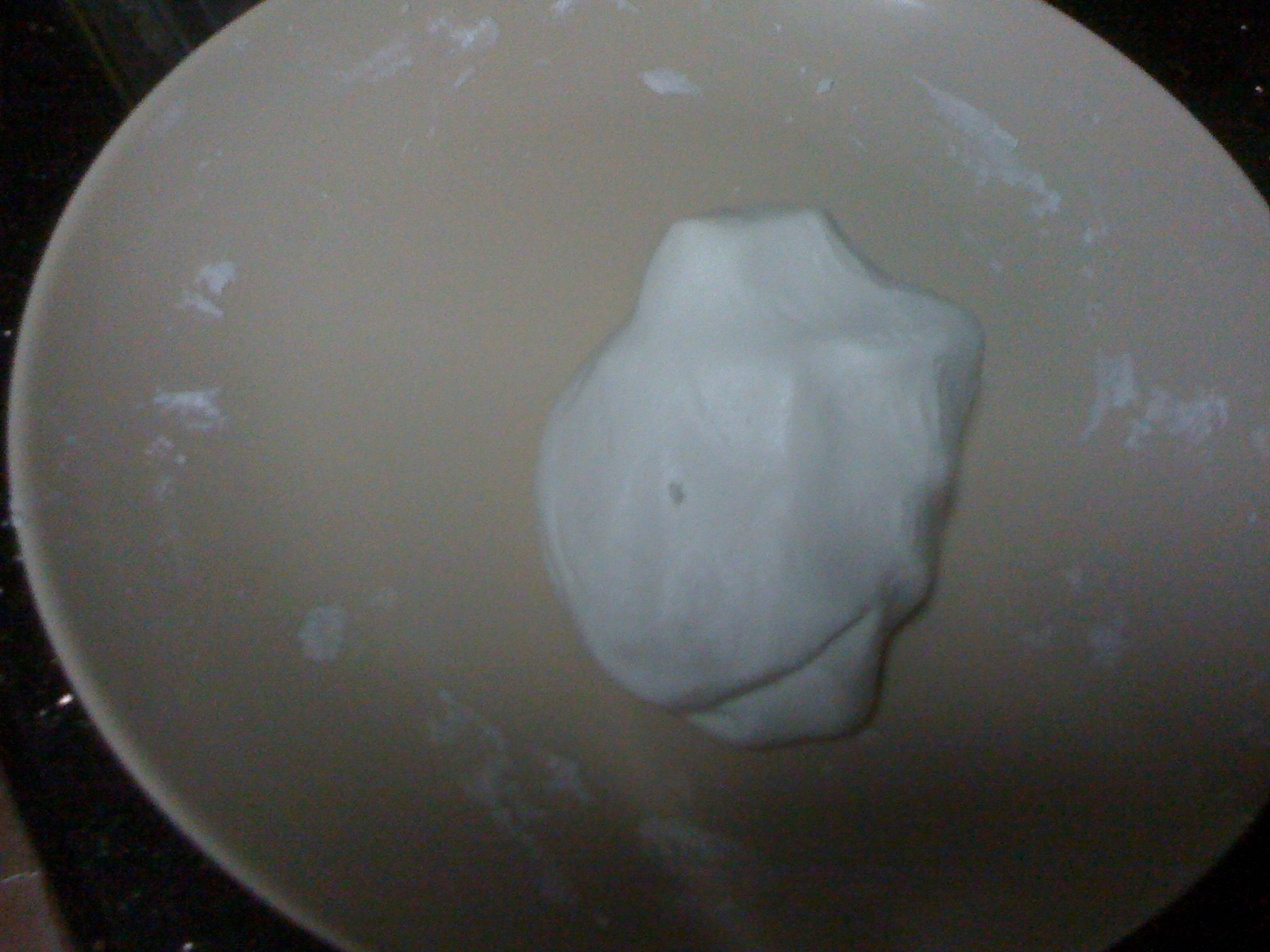 At this point, she got a cup with some water and then slowly mixed this all together by hand, until it became a … thing… that looked sort of like dough, and sort of like colorless Play-Doh.