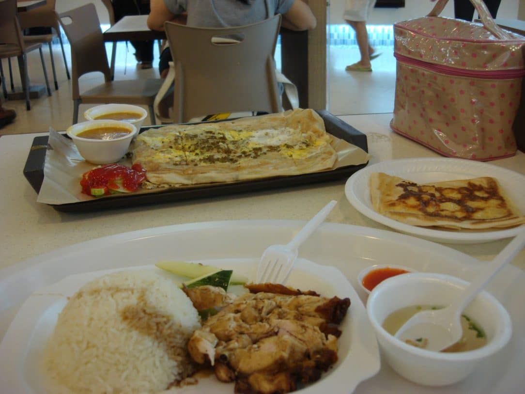 As we walked up to the “Indian Muslim” stall, the guy behind the counter had an amused look on his face. Maybe there aren’t too many white guys that order Muslim food in this area? Well, that probably goes without saying. Anyhow, we got another order of murtabak, mutton this time, and a cheese roti prata. I also went to the next stall called “Muslim Food” and got an order of chicken rice. It had another name in front of that, but I can’t remember what it was. So, we had a pretty good spread of food between the two of us.