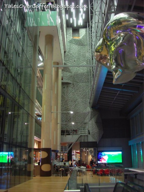 On our way back down through the building we noticed that different areas seem to have different themes. Various architectural tricks were used like having a ramped area with stores that are offset from the normal floor level to draw attention to them. There is also a giant wall inside that you can climb. I noted it last time but this time it seems functional, if unused.