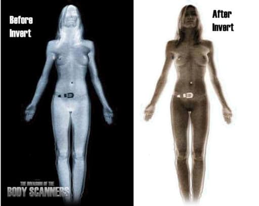Back in January, when talk of putting body scanners in airports was running at full steam, I posted my opinion on the whole matter, which is, in short that it’s a horrible idea that offers up way too many opportunities for abuse of the system by less than ethical employees and the government. I pointed out how accurately the body scanners portray people’s forms and how some countries had even banned the use of body scanners on children because it was a violation of child pornography laws that state that nude images of children cannot be created. Additionally, I pointed out ways in which the images could be removed from the area, and even how simple photo editing could reverse the colors to create accurate color nude images of people. Here are the example images I posted: